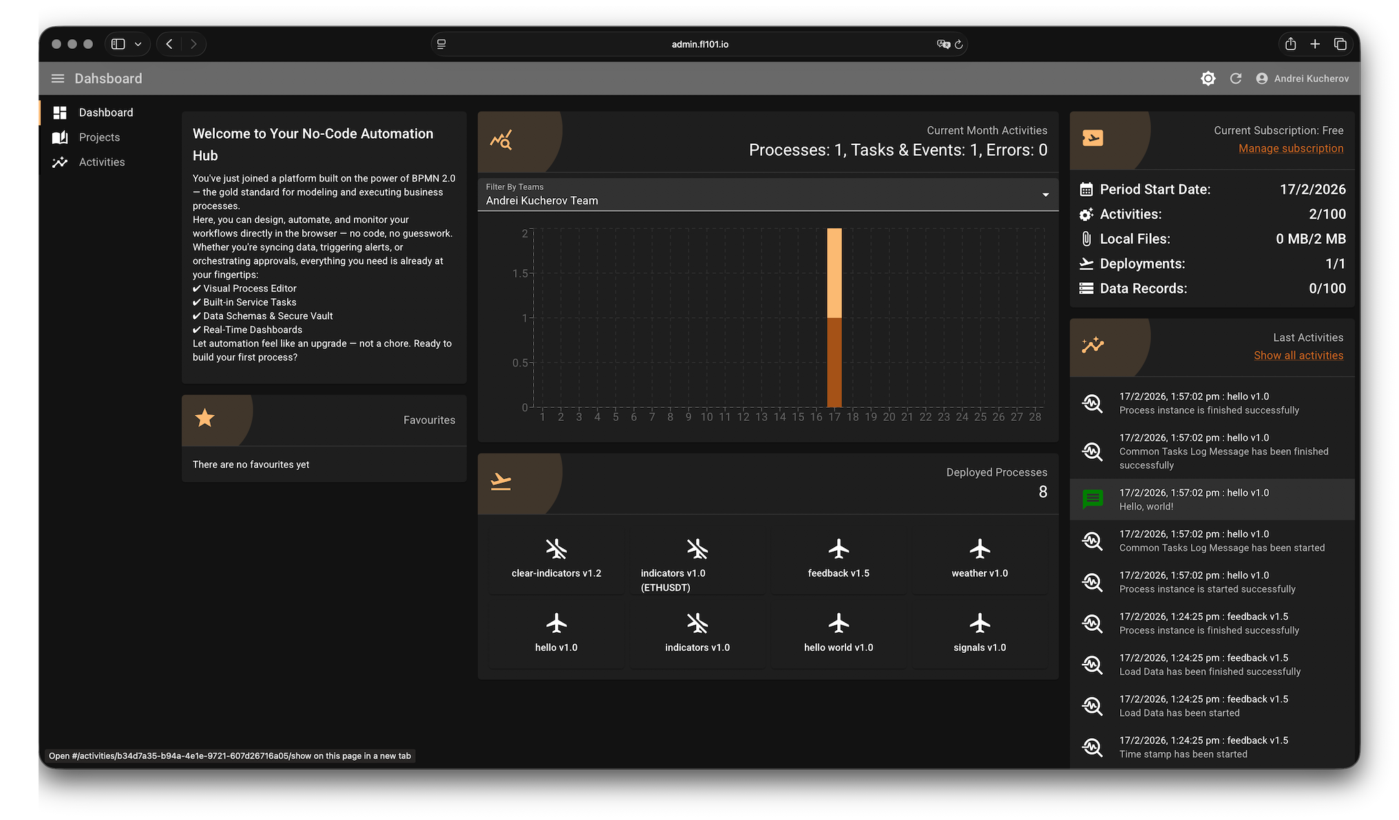 The Dashboard is the first page you see after logging in. It presents a collection of helpful widgets designed to give you a quick overview of your team’s activity. On the left side, you'll find the Notes widget, which highlights important announcements and platform updates, followed by the Favourites widget — your personalized shortcuts to frequently used resources. In the center column, there’s a bar chart visualizing current month activity. It tracks daily counts of service task executions and errors, along with a monthly total. Just beneath it, a list of your deployed processes provides direct access to process operations. On the right-hand side, the Last Activities list displays the 10 most recent events from your running processes, making it easy to stay informed at a glance.