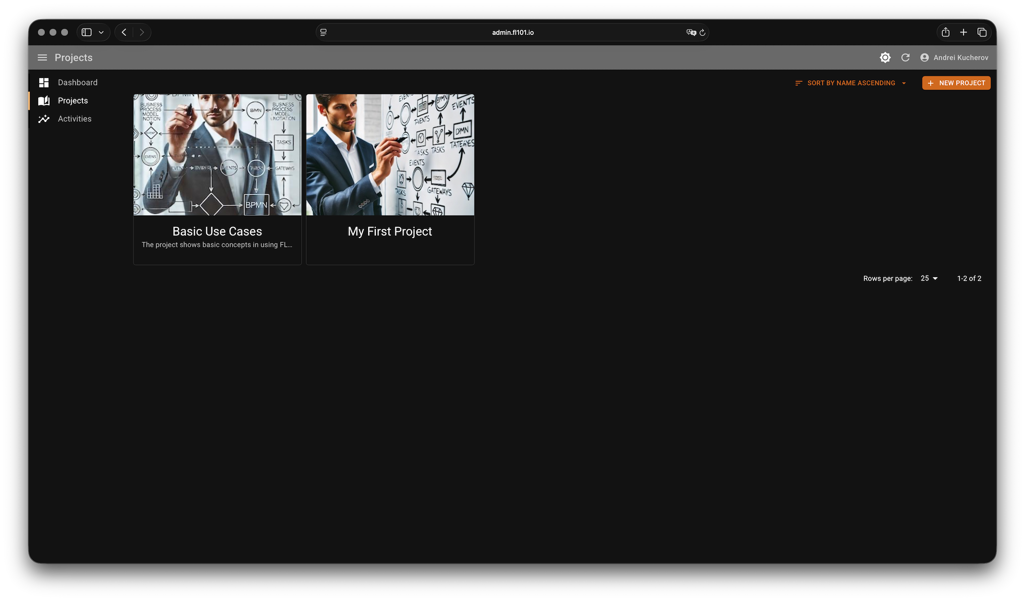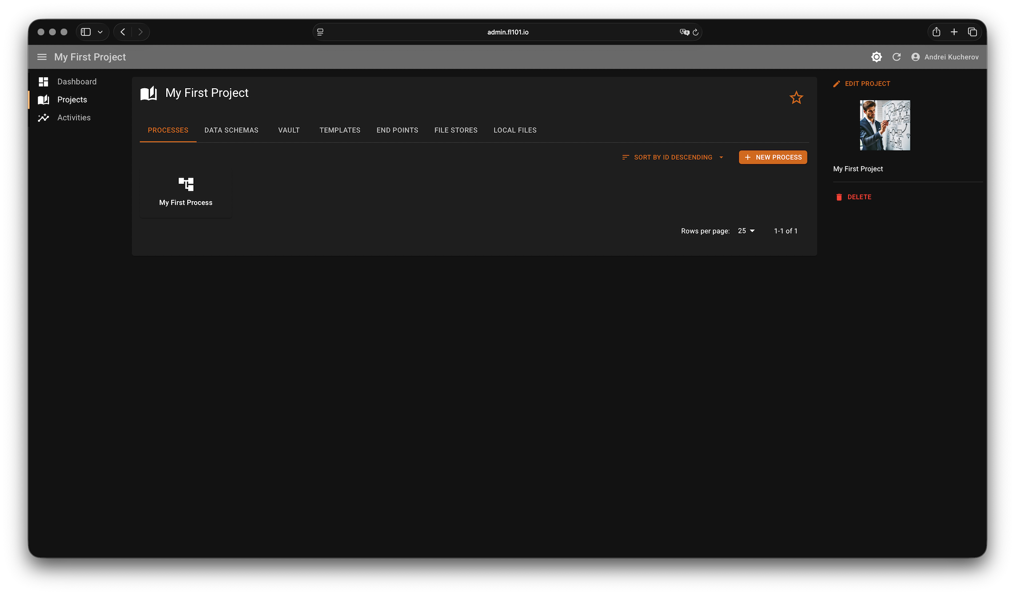 While processes are created from the project page, their structure and logic are defined later using the dedicated process modeler. You can also update the project’s name, description, and image at any time. And when a project is no longer needed, it can be safely deleted along with all its associated resources in one step.