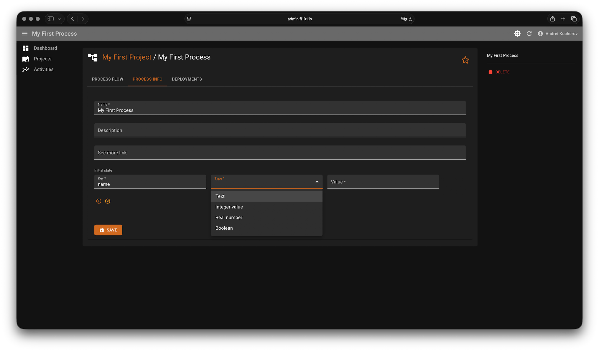 The Process Info tab allows you to update the process’s name and description and define an initial state — a collection of optional, typed key-value pairs. These values do not drive execution directly; instead, they serve as a base for generating the execution state when a process instance is launched. The available types include Text, Integer, Real Number, and Boolean. These values can be referenced during execution, for example as input parameters to service tasks. JSON Path is used to access them — if the state includes a "name" property at the root, it can be referenced as $.name. The section Execution State explains this mechanism in greater detail.