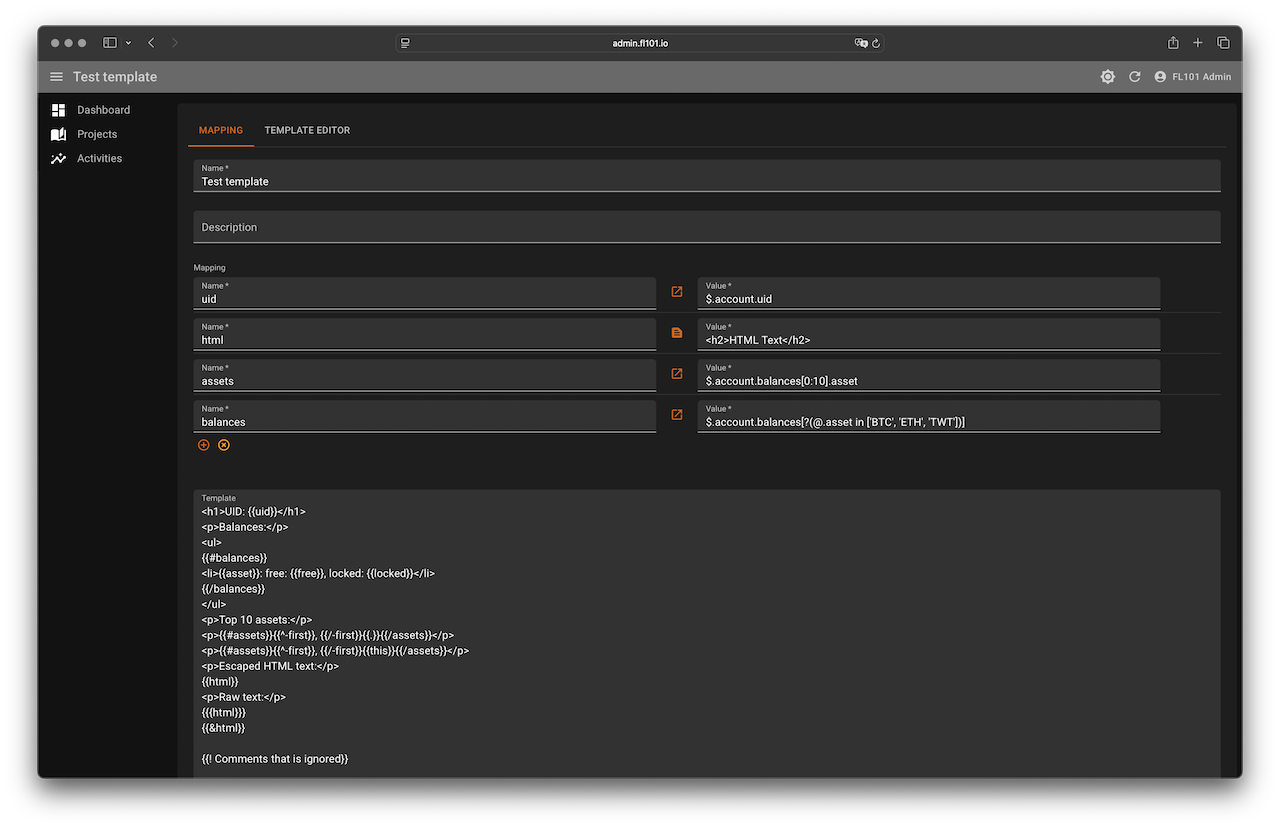Each template has a mapping section, where you assign keys to either static values or JSON Path expressions. When a template is rendered, each tag is replaced with its corresponding value from the Execution State.