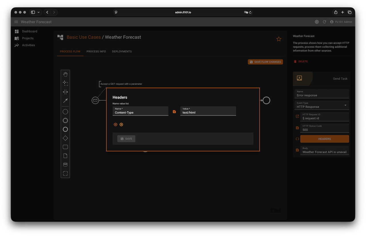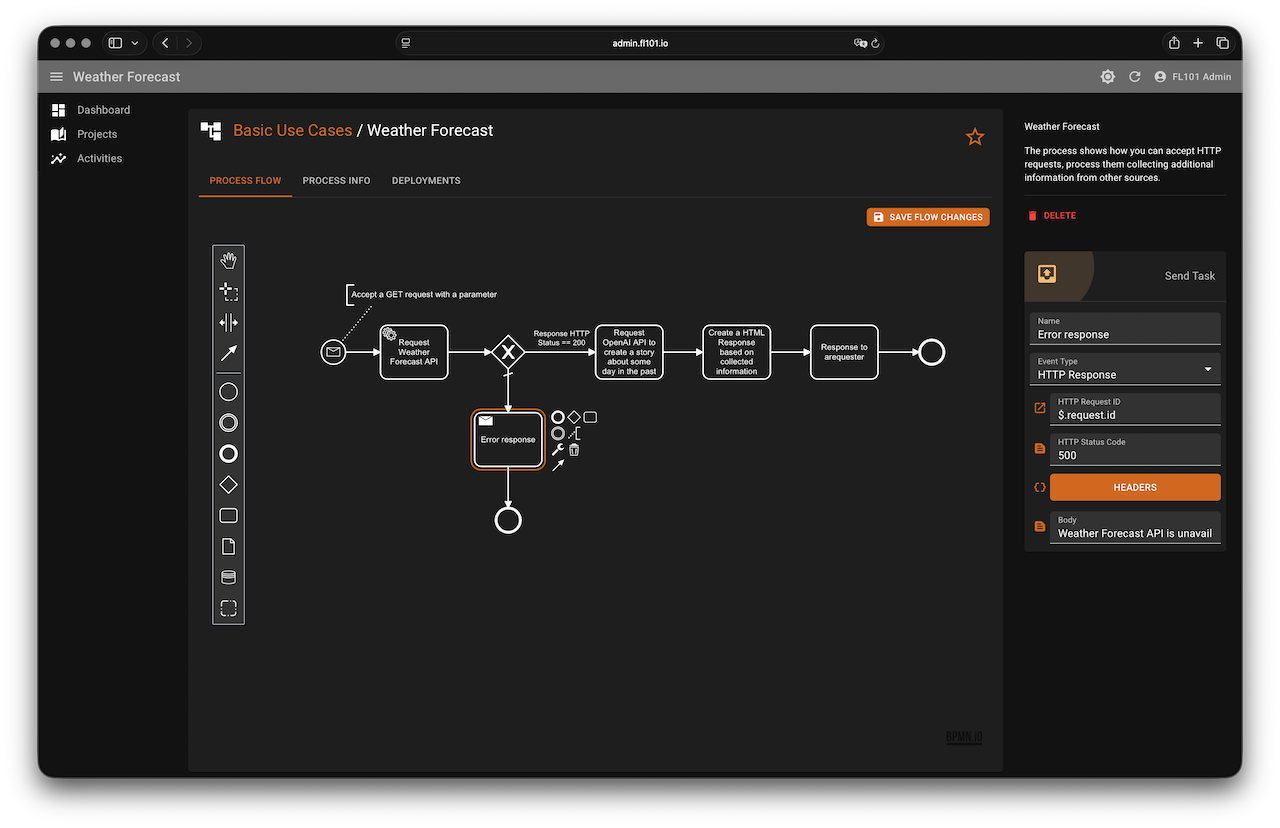 $[?(@.forecast.status == 200)] - Error path (mark as default): send a simple HTML error page (or 500 response) if the status is not 200.