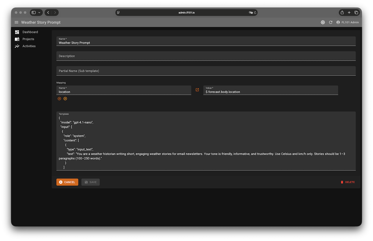 Create a Template named “Weather Story Prompt” with the following content (feel free to tweak the tone):