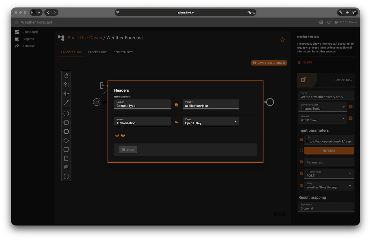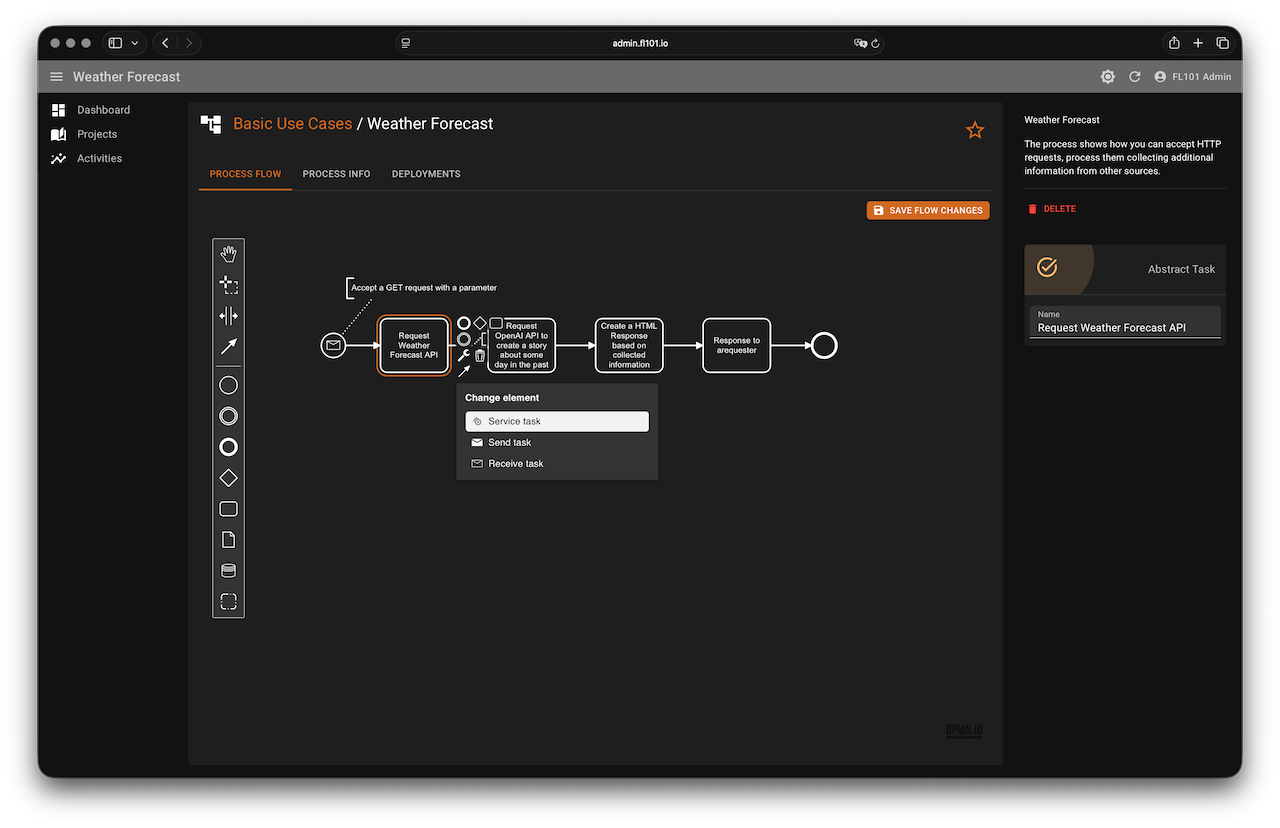 Convert the first Abstract Task to a Service Task → Internet Tools → HTTP Client with these settings: