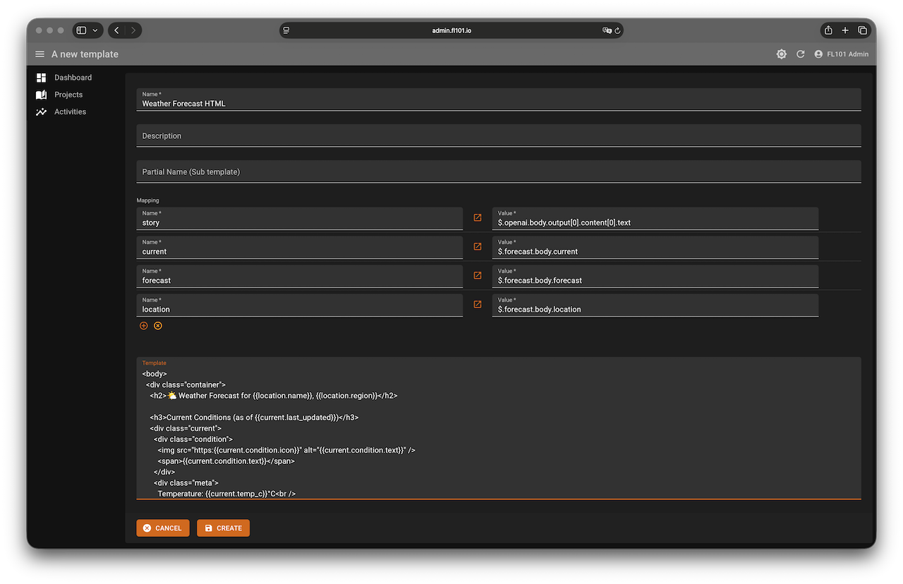 Create a second template named “Weather Forecast HTML” with these local variables:
