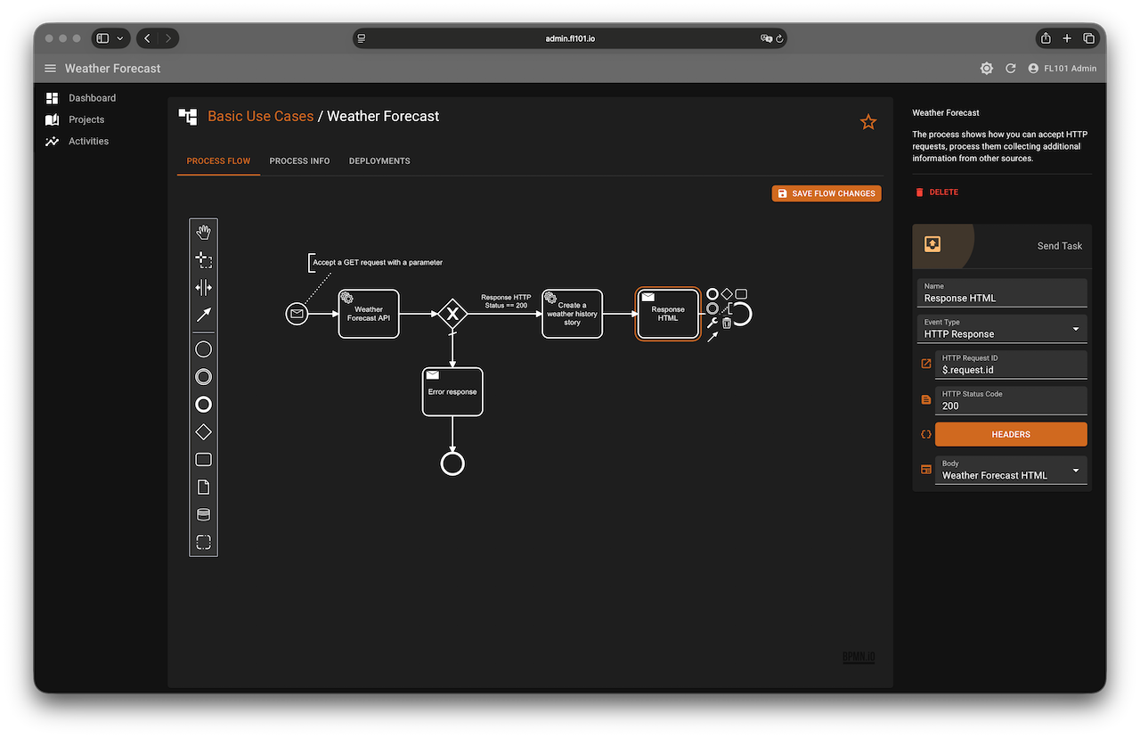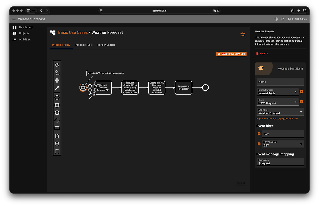This use case demonstrates how to build an engaging, real-time web service using FL101. The process accepts a simple HTTP GET request with a location parameter and instantly returns a beautifully formatted HTML page containing: