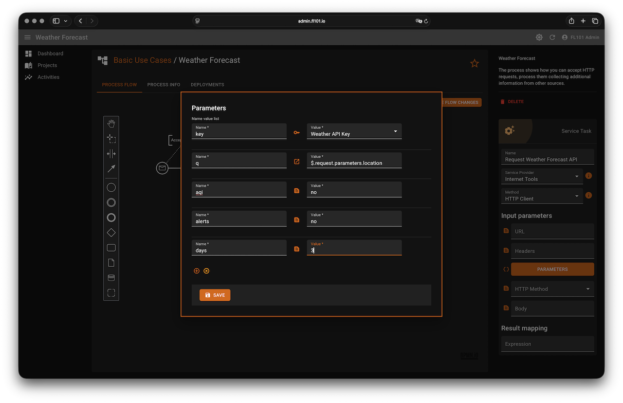 key→ Vault →WeatherAPI Keyq→ Expression →$.request.parameters.locationaqi→noalerts→nodays→3