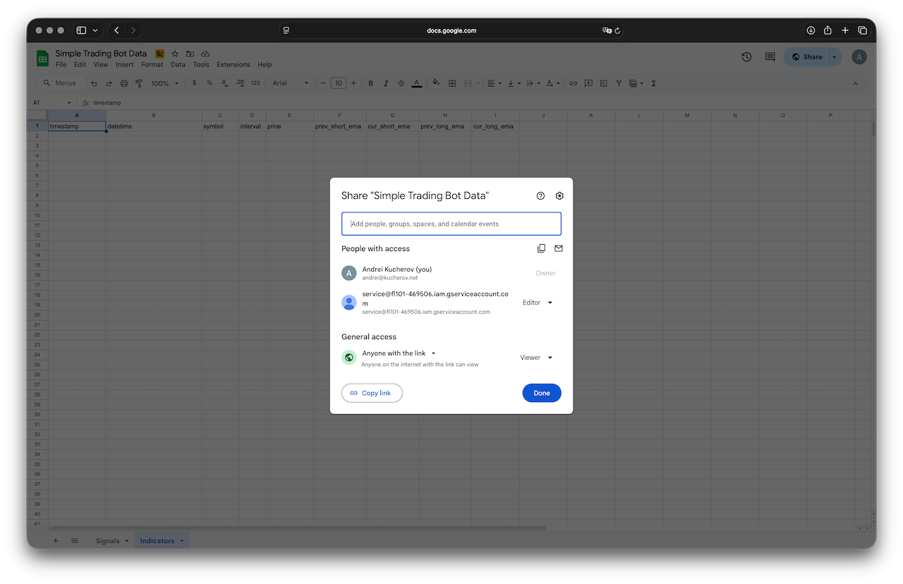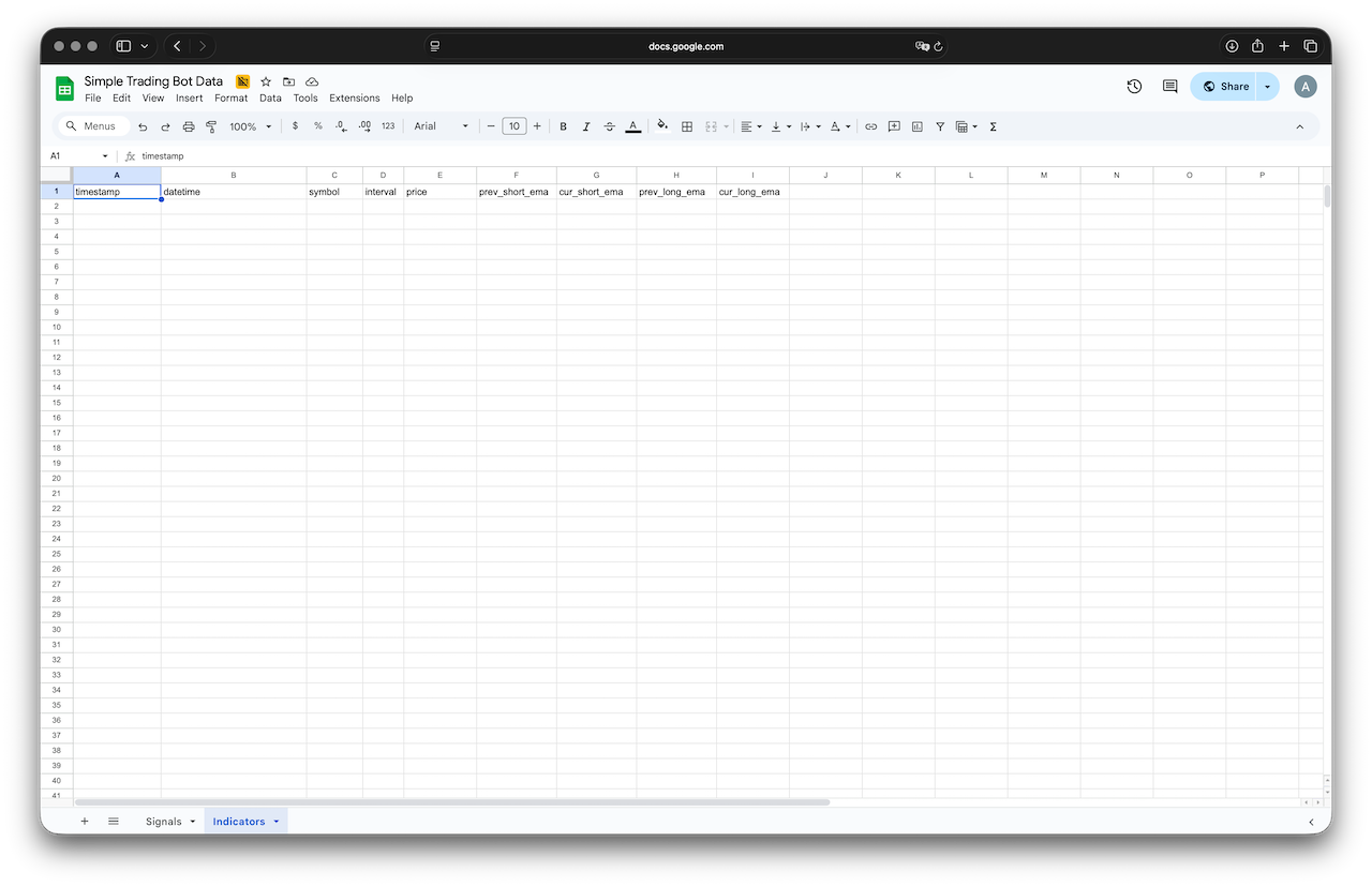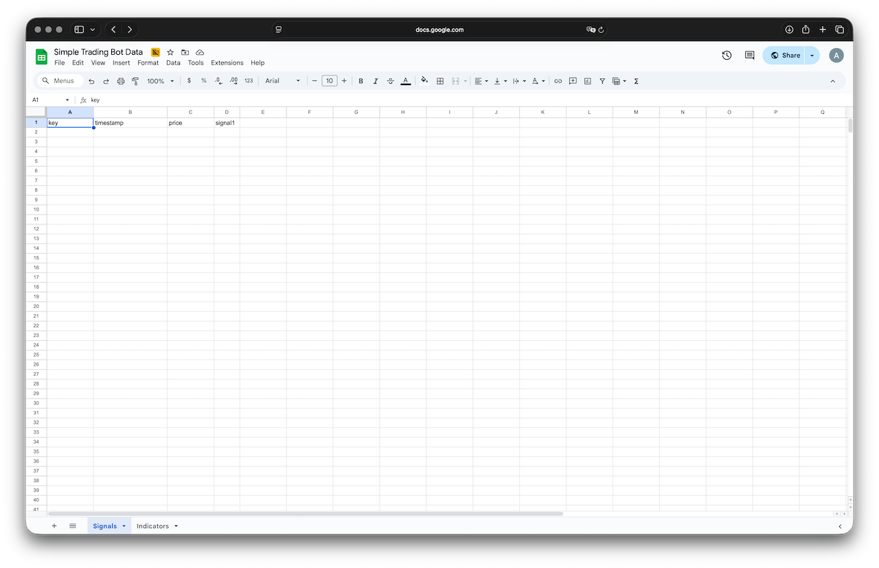 We’ll use this shared spreadsheet to store indicators and signals: