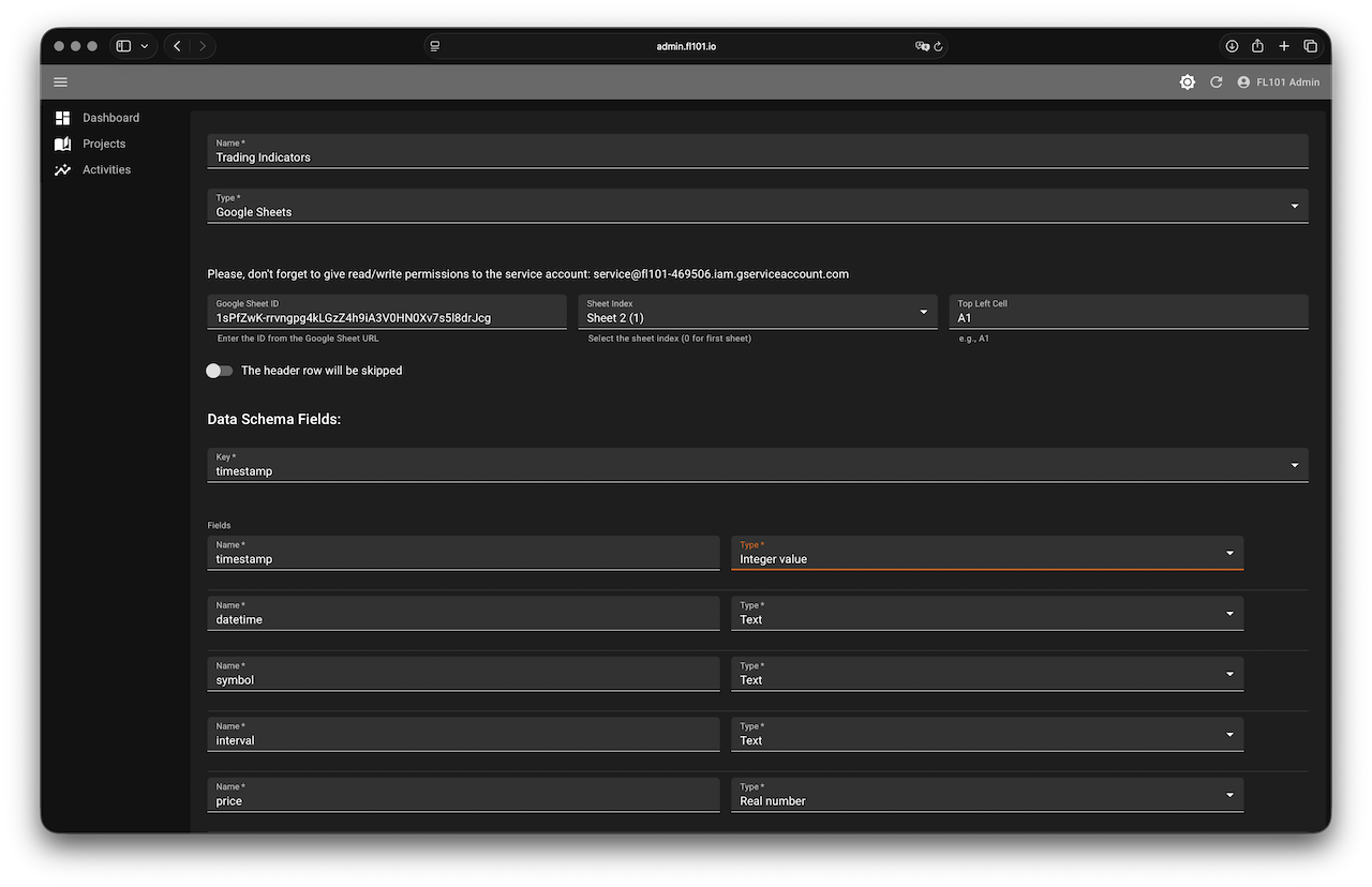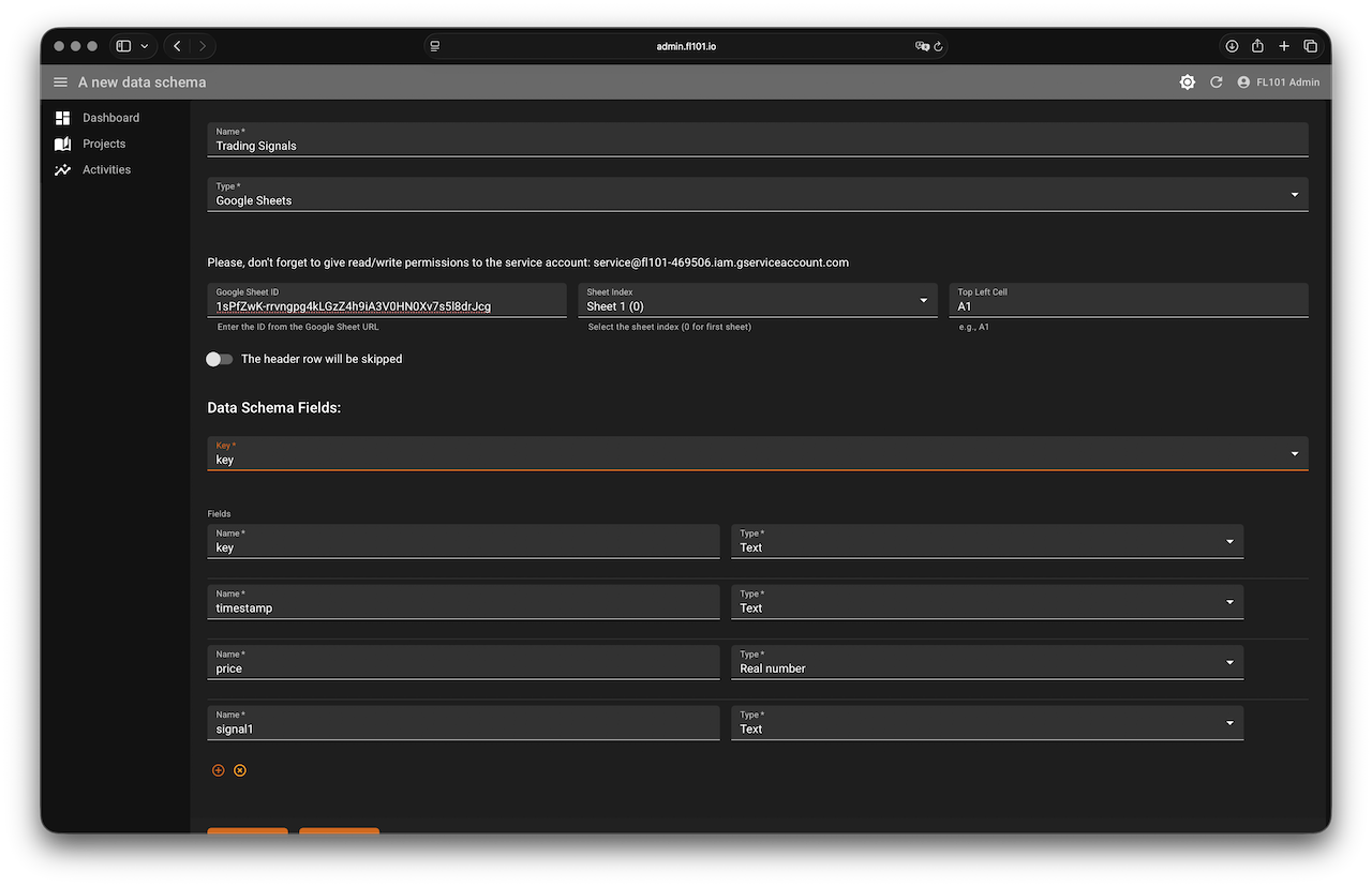 In your FL101 project create two Google Sheets data schemas (one for each sheet) with the columns shown in the sheet. Also create a simple template called “Signal Key” with the content: