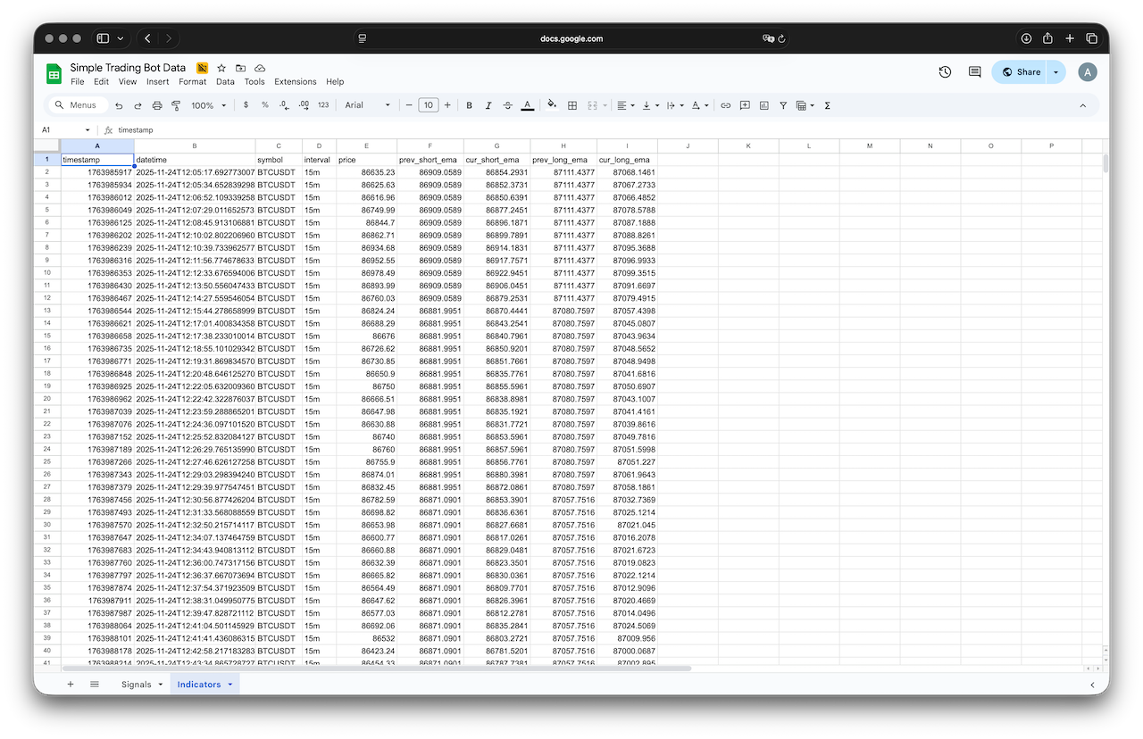 - Indicators – fetches candlestick data from Binance every minute and calculates short & long EMAs