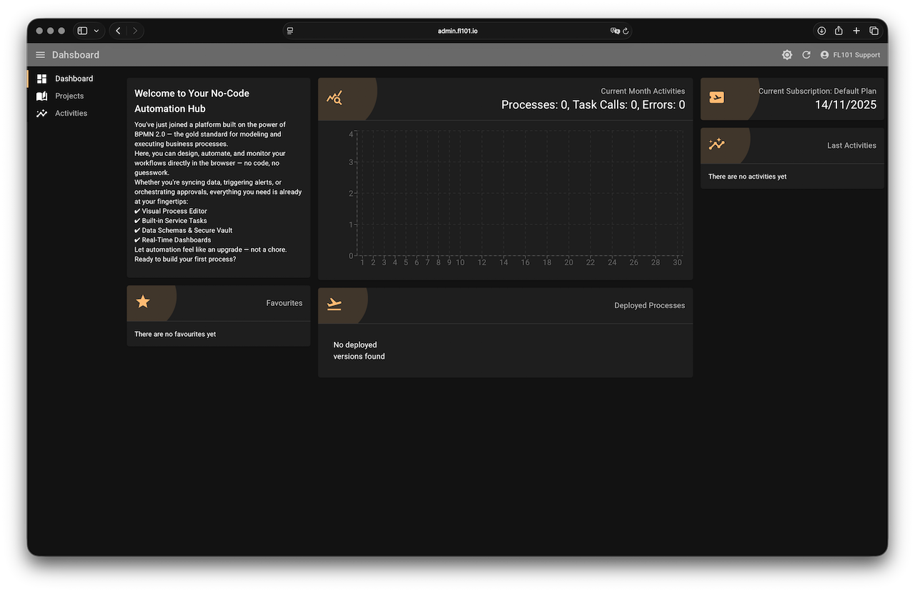 The Dashboard is the first page you see after logging in. It presents a collection of helpful widgets designed to give you a quick overview of your team’s activity. On the left side, you'll find the Notes widget, which highlights important announcements and platform updates, followed by the Favourites widget — your personalized shortcuts to frequently used resources. In the center column, there’s a bar chart visualizing current month activity. It tracks daily counts of service task executions and errors, along with a monthly total. Just beneath it, a list of your deployed processes provides direct access to process operations. On the right-hand side, the Last Activities list displays the 10 most recent events from your running processes, making it easy to stay informed at a glance.