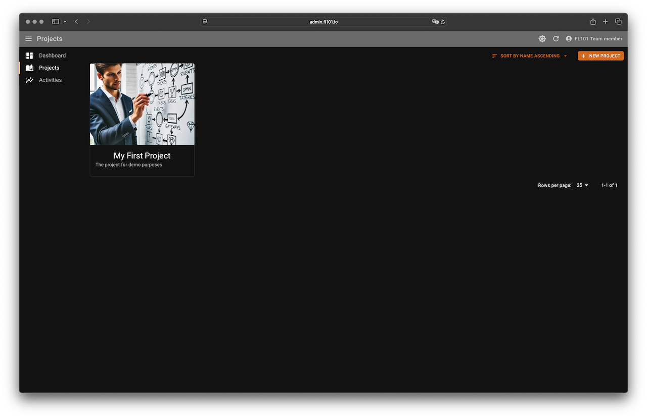 The Projects page displays all the projects available to you, whether created by you or shared within your team. You can sort projects by name and create new ones with a simple click. When creating a new project, only the name is required — optional fields include a project description and a representative image. Projects serve as containers for all your automation work, bringing together processes, data schemas, and secrets vault into a unified space.