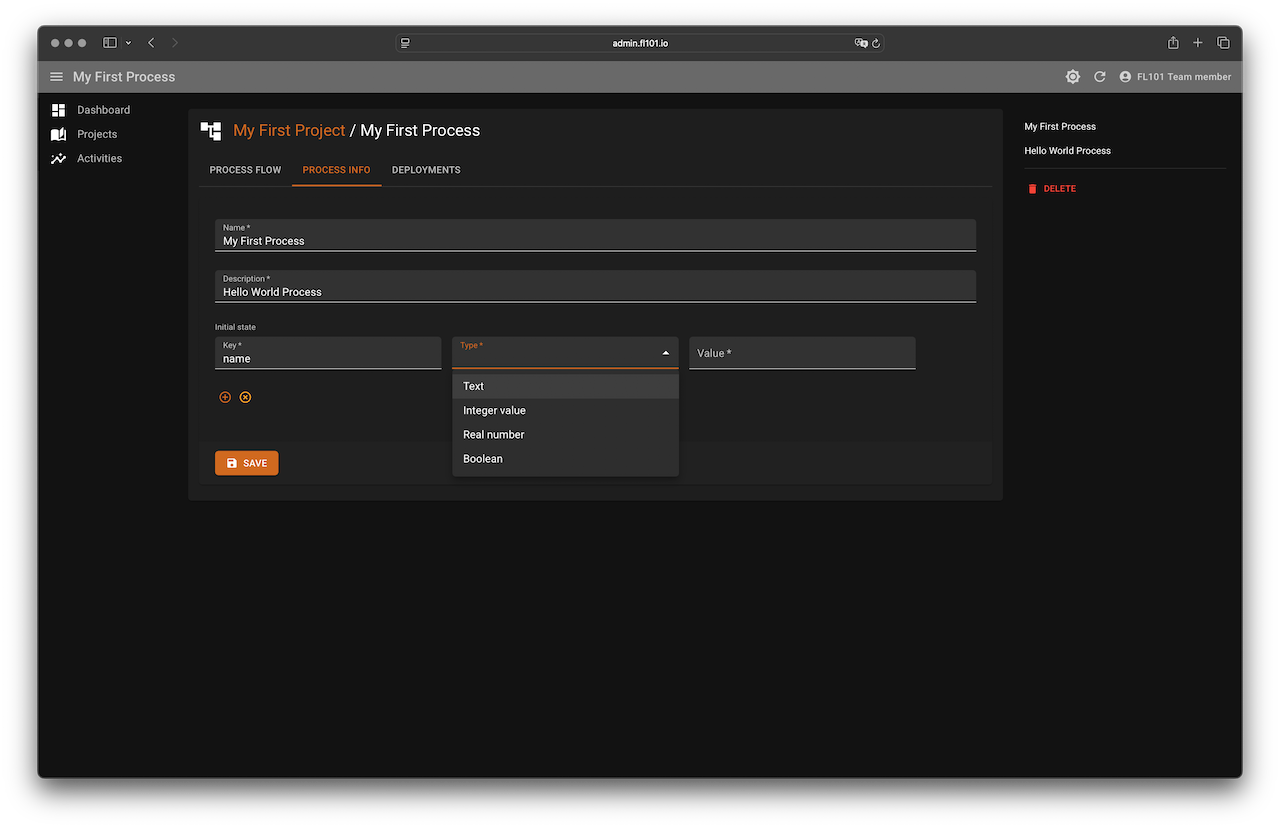The Process Info tab allows you to update the process’s name and description and define an initial state — a collection of optional, typed key-value pairs. These values do not drive execution directly; instead, they serve as a base for generating the execution state when a process instance is launched. The available types include Text, Integer, Real Number, and Boolean. These values can be referenced during execution, for example as input parameters to service tasks. JSON Path is used to access them — if the state includes a "name" property at the root, it can be referenced as $.name. The section Execution State explains this mechanism in greater detail.